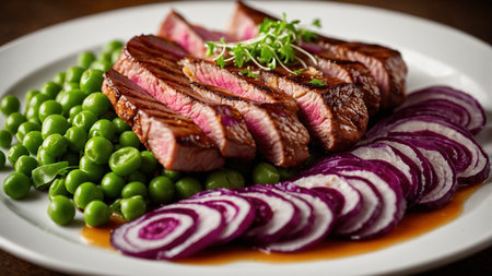 A deliciously tender grilled steak perfectly presented with fresh peas and artistic slices of red onion, garnished by a touch of fresh green herbs, all served on a pristine white plate for a gourmet touch. AI generated image