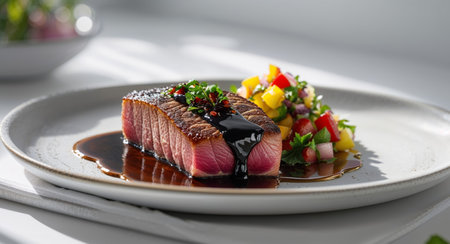 AI Generated. Gourmet Tuna Steak with Balsamic Glaze and Salsa