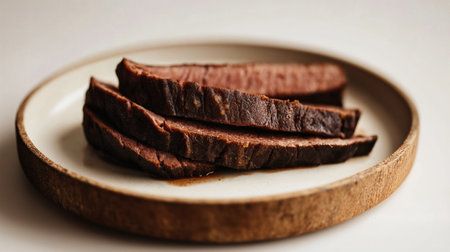 A close-up view of thick, charred slices of beef brisket arranged on a rustic, wood-edged ceramic plate. The rich texture and deep color reflect slow cooking and intense flavor, perfect for showcasing gourmet smoked meats.