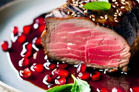 Roast beef with pomegranate sauce on a dark background