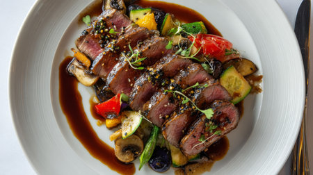 A delicious serving of tender beef steak beautifully sliced and paired with colorful saut