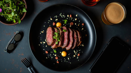 A beautiful presentation of grilled steak slices showcasing juicy pink meat and a perfectly seared crust. Ideal for culinary projects, gourmet menus, and food photography.