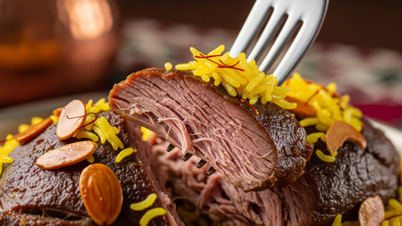 Gourmet Kabsa with tender lamb and saffron rice garnished with almonds and fork