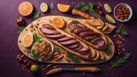 Sliced roast beef with spices and herbs on a cutting board. AI Generated.