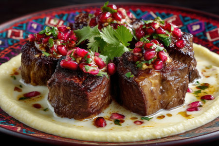 Delicious grilled lamb medallions served on colorful mashed potatoes and garnished with pomegranate seeds and rosemary