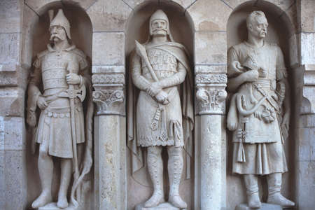 The guardians of the famous Fishermans Bastion on the Buda hill. Statues, old town, Budapest