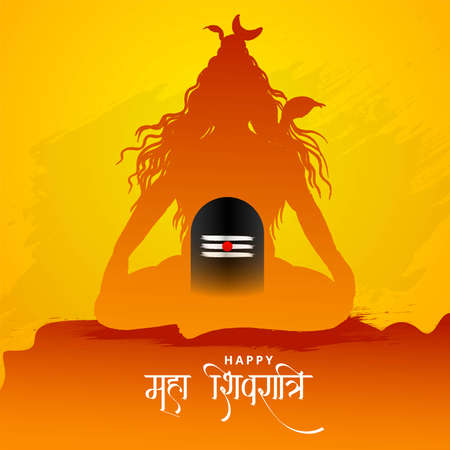 Happy Maha Shivaratri greeting card - Shiva Linga decorated with flowers, trishula, damru and bilva leaves. Hindu festival celebrated of Shiva Lord