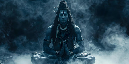 Serene lord Shiva statue posing on a smoky background, representing spirituality and divinity in Hinduism