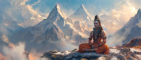 Digital fantasy illustration of a meditating deity man in a mystical landscape, suitable for spiritual or fantasy themes. God Shiva. Hindu deity.