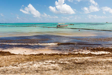 Tropical Mexican Caribbean beach and sea with Sargazo seaweed sea weed net rope and buoys in clear turquoise blue water in Playa del Carmen Mexico.