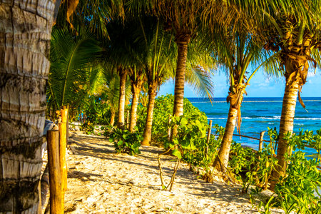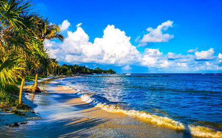 Tropical mexican caribbean beach landscape panorama with clear turquoise blue water and palm trees palms tree in Playa del Carmen Mexico.