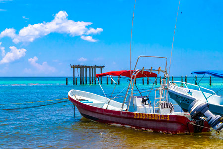 Playa del Carmen Quintana Roo Mexico May 22, 2023 Boat yacht catamaran ship ferry jetty pier and harbor at the tropical Mexican Caribbean beach panorama view and turquoise blue water in Punta Xcalacoco Playa del Carmen.
