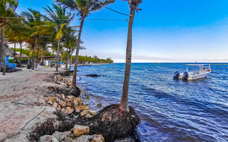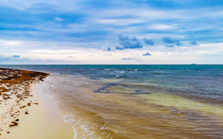 The beautiful Caribbean beach totally filthy and dirty the nasty seaweed sargazo problem in Playa del Carmen Quintana Roo Mexico.