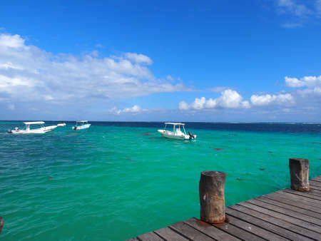 Boat yacht ship ferry jetty pier and harbor at the tropical mexican beach panorama view from Playa 88 and Punta Esmeralda in Playa del Carmen Mexico.