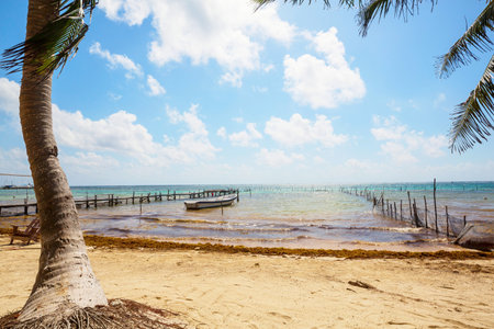 Palm leaves and fishing boats at sunrise on the sandy beach of the Caribbean in Mexico