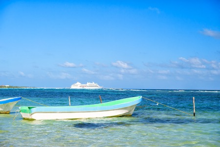 travelling. boat on beach in clear sea or ocean water and white cruise ship liner on sunny day on blue sky in Costa Maya, Mexico. Summer vacation