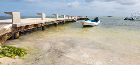 Caye Caulker, Belize - February 28, 2017: Beautiful tropical shore with pier for boats on the island of Caye Caulker on the Barrier Reef in the Caribbean Sea