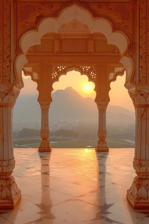 An ornate archway displays exquisite carvings and intricate designs typical of Indian architecture, illuminated beautifully by the warm hues of sunset.