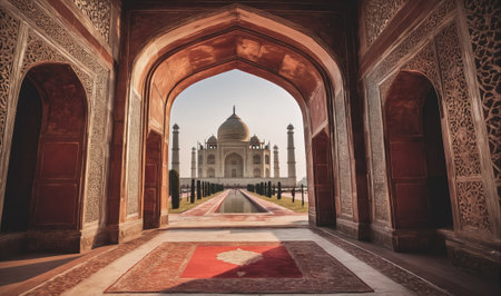 Taj Mahal through arch, Indian Symbol - India travel background. Agra, Uttar Pradesh, India
