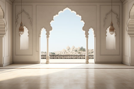 3d rendering of a beautiful white room with arches and windows