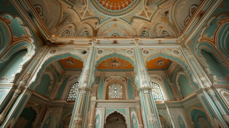 Discover an elegant corridor featuring intricate design, vibrant artwork, and tropical plants. This serene space showcases architectural beauty amidst a rich cultural heritage.