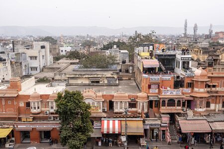 various shops and establishments along Jaipur city street. Taken on January 16th 2020. Jaipur, India.