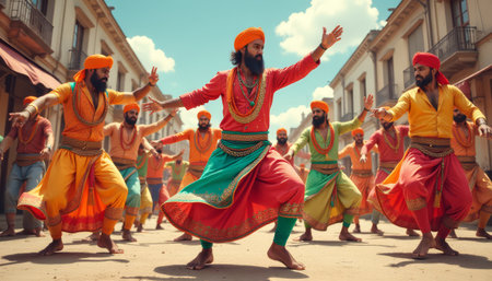 A group of men dressed in colorful traditional attire performs an energetic dance in a festive atmosphere. Their movements are synchronized, showcasing rich cultural heritage against a sunny backdrop.