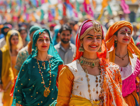 Vibrant of diverse culture and community at a colorful Indian festival parade filled with joyful people in traditional costumes and garments showcasing the rich traditions and heritage of the region