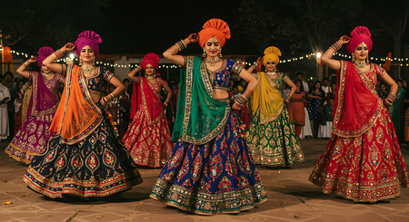 A group of indian women in traditional sari dancing at night.