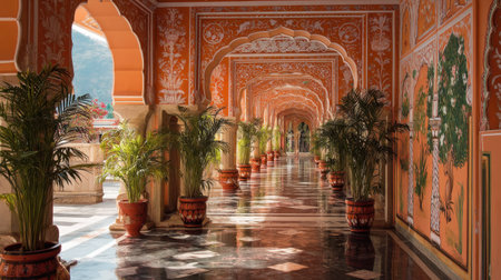 Discover an elegant corridor featuring intricate design, vibrant artwork, and tropical plants. This serene space showcases architectural beauty amidst a rich cultural heritage.