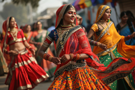 Indian women dancing on the streets in traditional dresses.