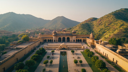 A stunning aerial view of a historic fort and beautifully landscaped gardens in India, showcasing the majestic architecture against a serene mountain backdrop.