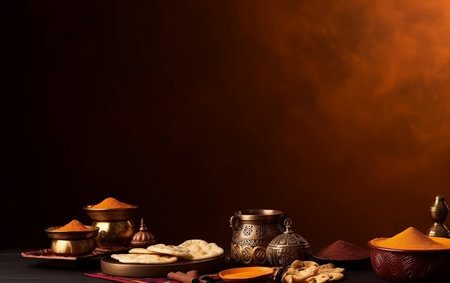 A panoramic, cinematic wide shot capturing a still life of traditional Indian festival gear. Empty,