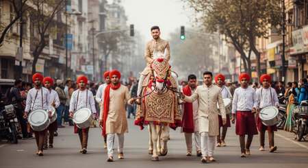 Groom on horse with traditional band in colorful indian wedding procession