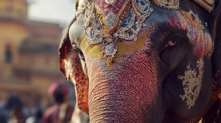 A beautifully adorned elephant showcases vibrant decorations, capturing the essence of cultural traditions in a stunning outdoor setting. Perfect for wildlife enthusiasts.