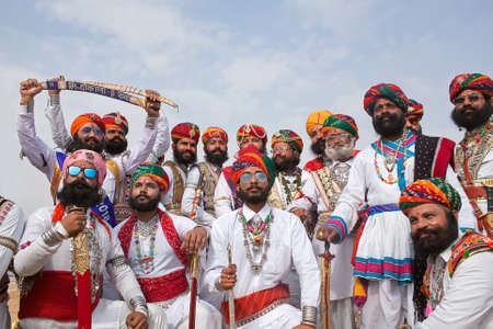 BIKANER, INDIA - JANUARY 12, 2019: Indian Rajasthani men in traditional clothes poses for a photo during Camel Festival in Rajasthan state
