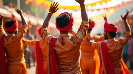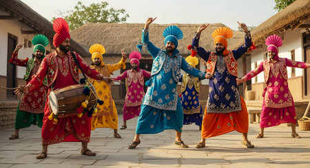 Men performing traditional Bhangra dance at the Lohri festival, rear view. The image captures the dynamic movements and colorful atmosphere of Punjabi culture in a festive atmosphere.