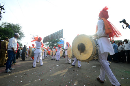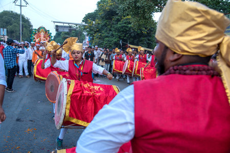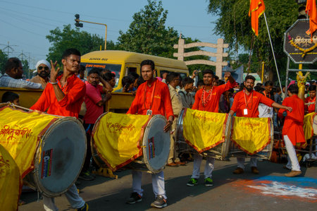 AMRAVATI, MAHARASHTRA, INDIA - 27 SEPTEMBER 2018: Crowd of unidentified people carrying Hindu God Ganesha for immersion with drums and music at water bodies during Ganesha festival. Annual festival.