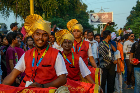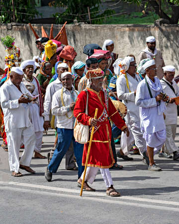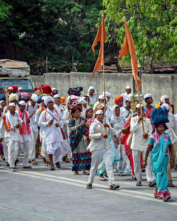 Pune,Maharashtra, India - June 26th, 2019: Male devotees carrying flag during procession of Pandharpur wari.