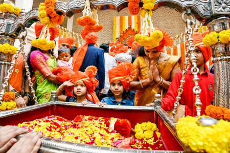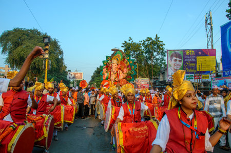 AMRAVATI, MAHARASHTRA, INDIA - 23 SEPTEMBER 2018: Unidentified faithful people carrying Hindu God Ganesha before immersion near water bodies during Ganesh festival. Annual festival.