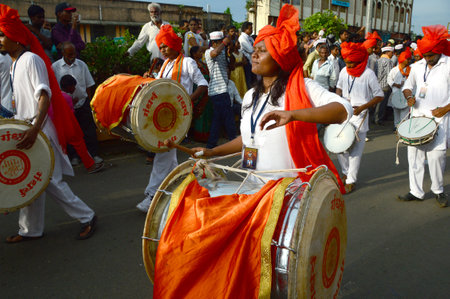 Pune, India - September 4, 2017: Shivmudra Dhol Tasha Pathak playing dhol / drum on the streets of pune on the occasion of Ganpati visarjan festival / Anant chaturdashi Festival celebration in pune.
