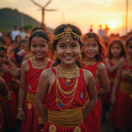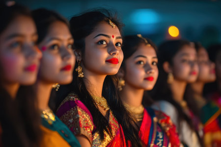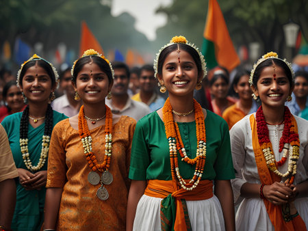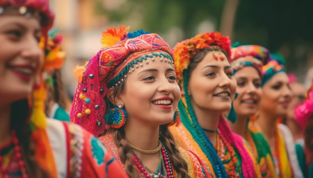 A group of young women dressed in colorful traditional attire participate in a cultural festival showcasing joy and elegance.