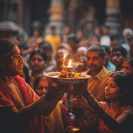 A shot of devotees performing Aarti, a Hindu ritual of offering light to the deity