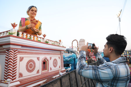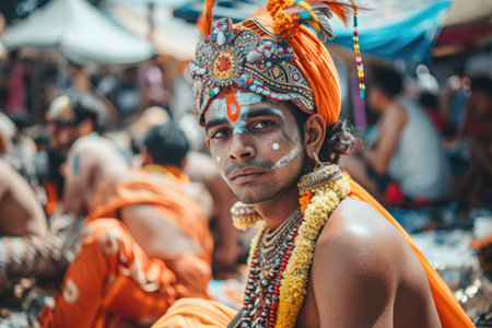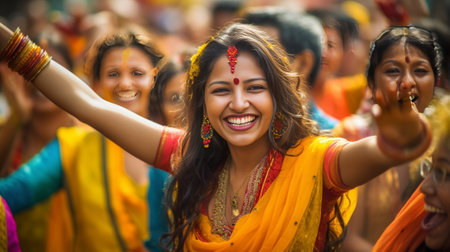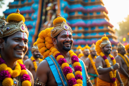 People at festival in traditional Hindu festival of Thaipusam, happy men and women holiday AI Generative