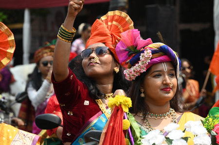 MUMBAI, INDIA - MARCH 30: Women dressed in traditional attire participate in a rally on the occasion of Gudi Padwa,at Girgoan, on March 30, 2025 in Mumbai, India. Gudi Padwa is a significant festival celebrated by Hindus in Maharashtra, and Yugadi in Karn