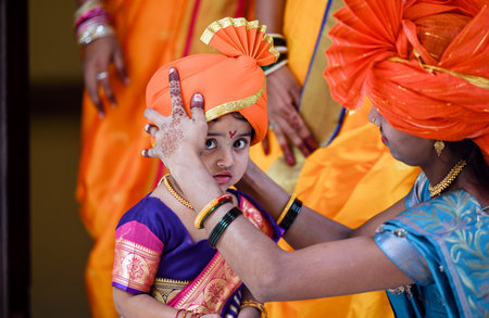 NEW DELHI, INDIA - FEBRUARY 19: Maharashtrian children in traditional attire took part in Shivaji Jayanti celebrations at Maharashtra Sadan on February 19, 2024 in New Delhi, India. Chhatrapati Shivaji Maharaj is one of the greatest Maratha rulers who car