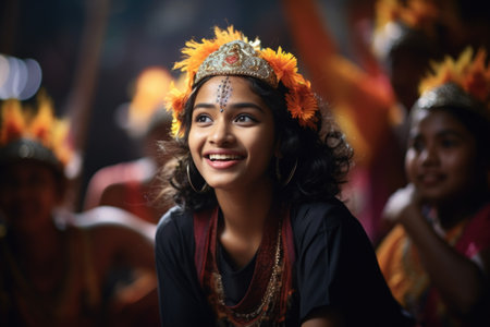 A joyful woman wearing a colorful traditional dress with a floral crown smiles amid a vibrant crowd during a lively festival, showcasing rich cultural heritage and celebration.