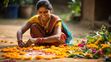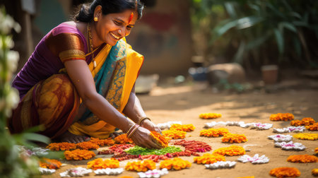 Beautiful Indian woman traditionally dressed making rangoli from flowers near the house in India