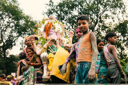 AMRAVATI, MAHARASHTRA, INDIA - 27 SEPTEMBER 2018: Unidentified faithful people carrying Hindu God Ganesha for immersion near water bodies during Ganesha festival. Annual festival.