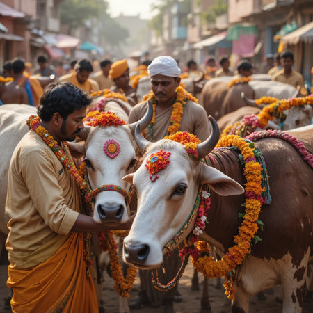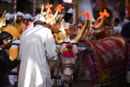 colourful Bullocks used for religious ceremony with handler